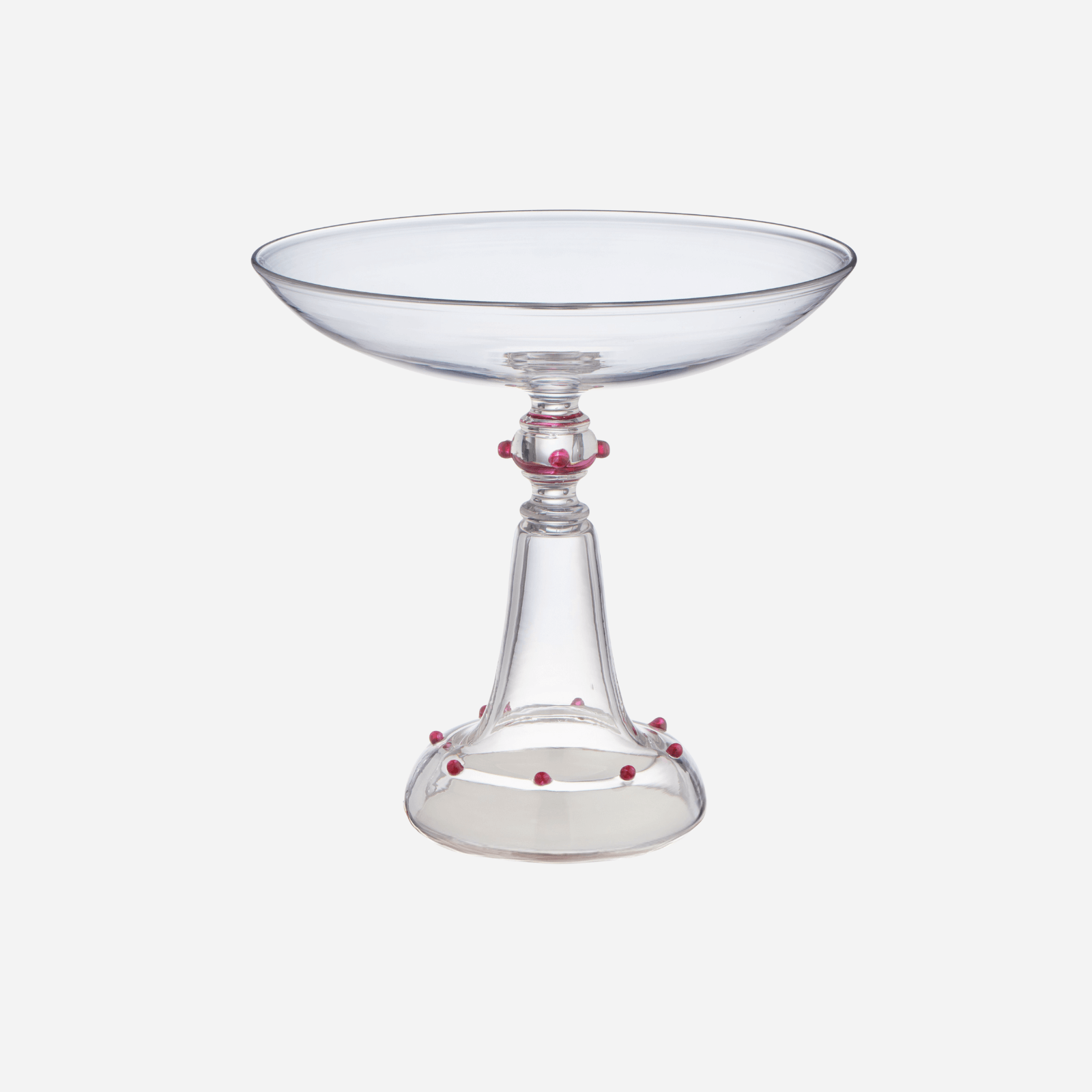 This charming glass tazza with red prunts dates from 1920 and remains in excellent condition with minimal wear.