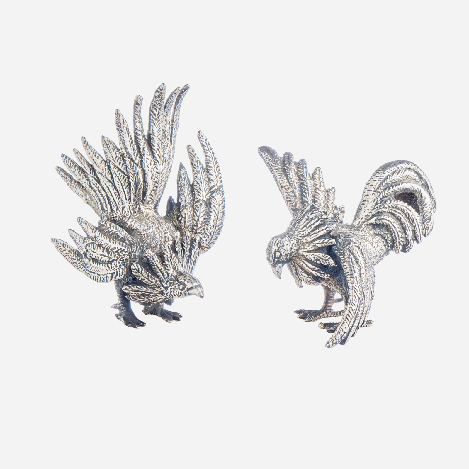 A charming pair of antique, sterling-silver roosters, originally sourced from Spain.