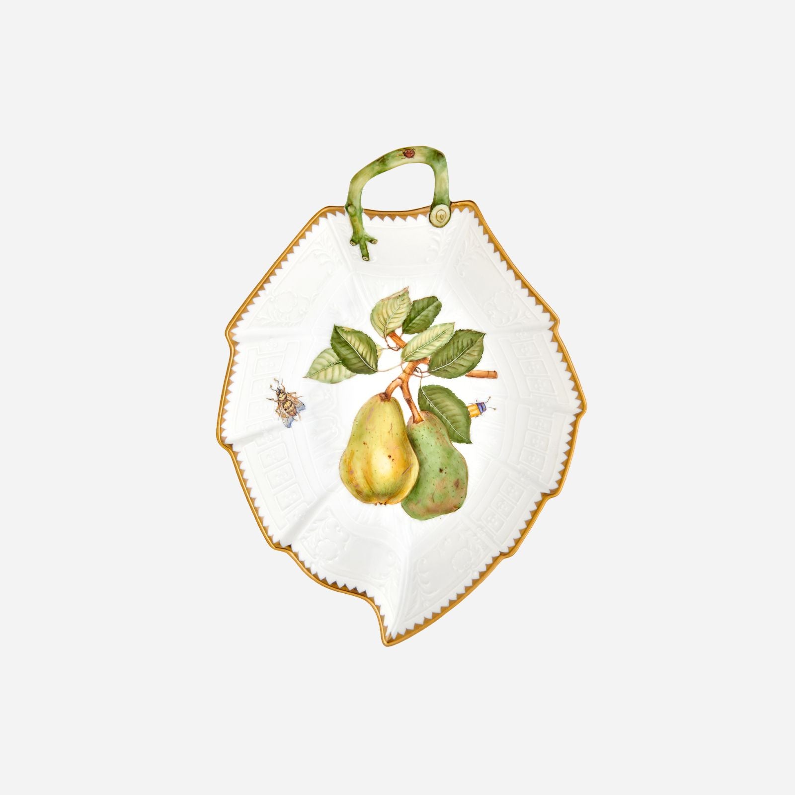 A leaf with a golden edge, this hand-painted pear dish brings a touch of whimsy to serving and styling.