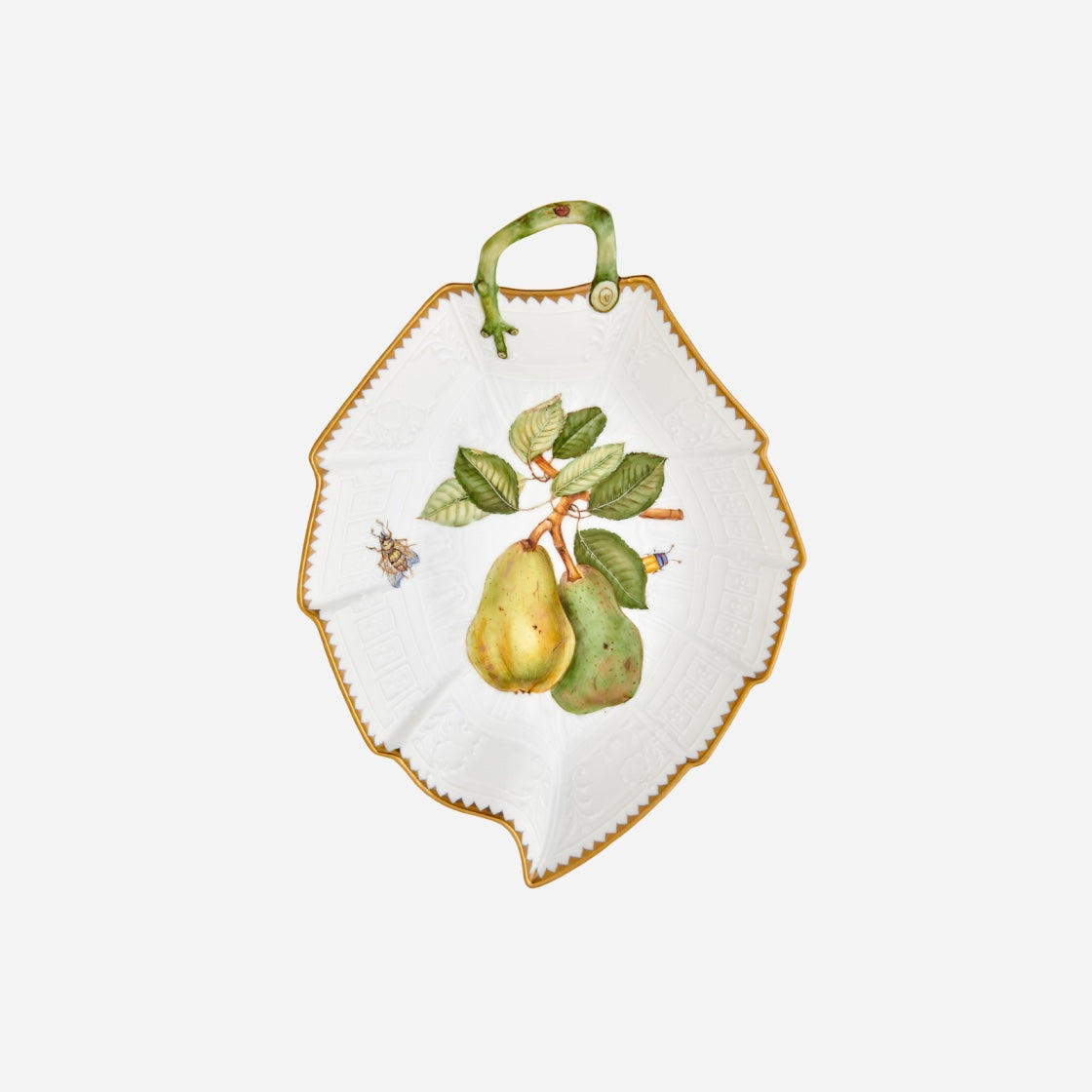 A leaf with a golden edge, this hand-painted pear dish brings a touch of whimsy to serving and styling.