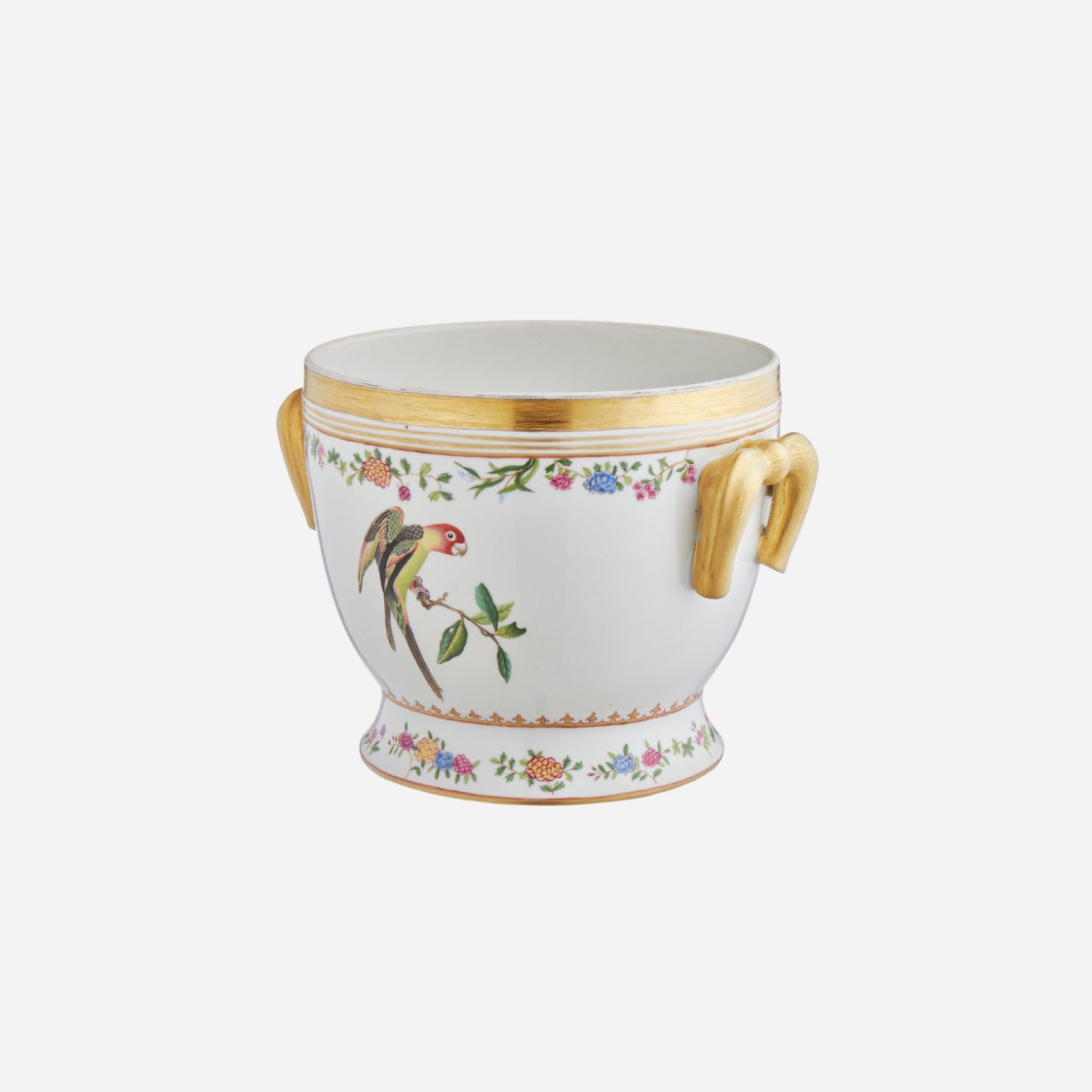 Crafted in fine hand-painted porcelain, this exclusive accessory is richly detailed with a vivid parrot, inspired by the ornithological studies of 19th-century masters John James Audubon and John Gould. Framed with delicate floral motifs and finished in gleaming gold gilt, each cooler is a celebration of natural beauty.