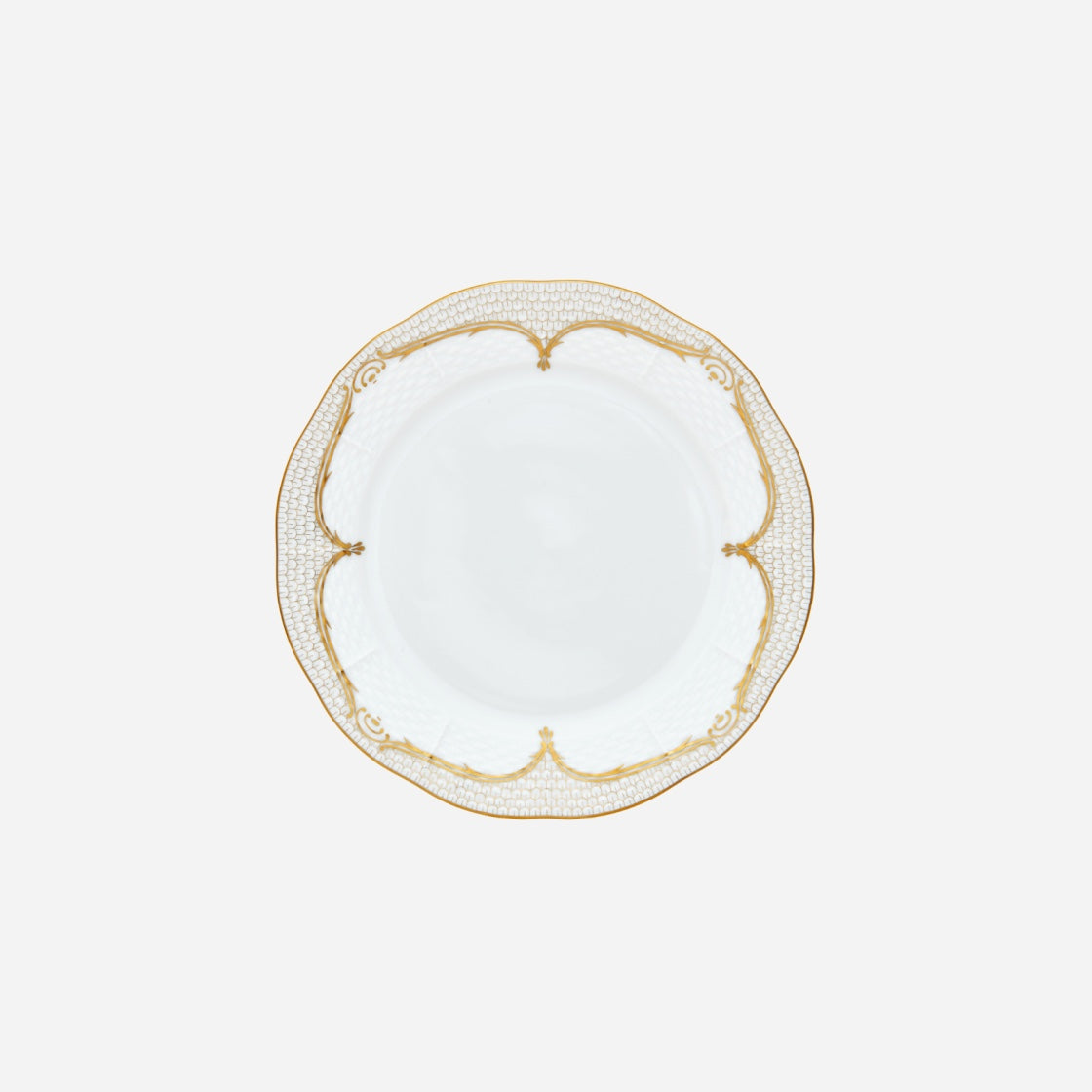 This dessert plate is meticulously handcrafted and painted in Hungary by Herend’s master artisans, featuring delicate 24-karat gold accents that glisten against pure white porcelain. The iconic fish scale motif, elegantly arranged in a petal-like pattern around the rim, creates a captivating play of light and texture, adding dimension and refinement to any table setting.