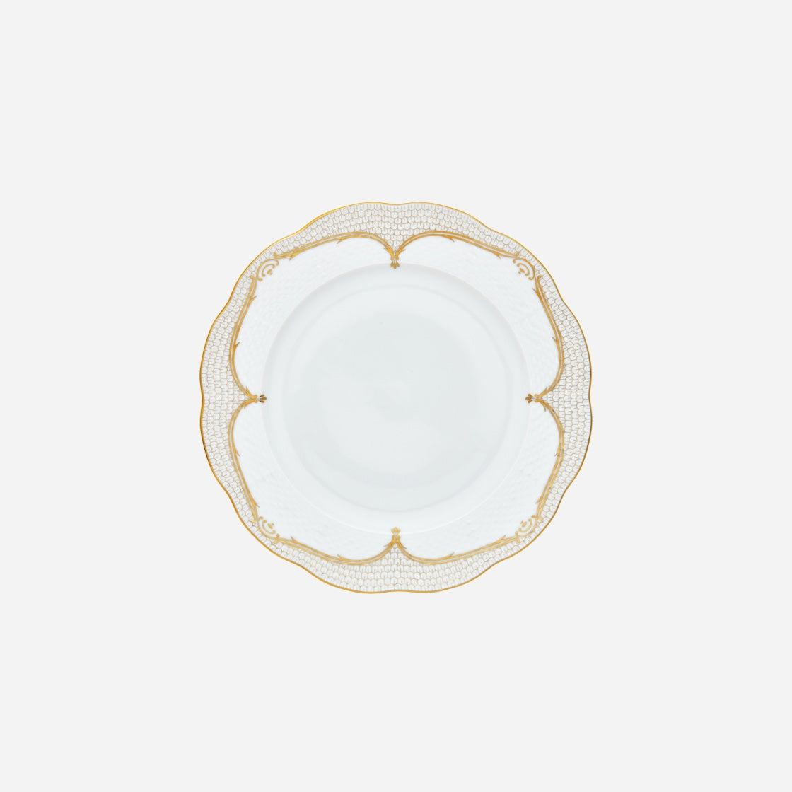 This dinner plate is meticulously handcrafted and painted in Hungary by Herend’s master artisans, featuring delicate 24-karat gold accents that glisten against pure white porcelain. The iconic fish scale motif, elegantly arranged in a petal-like pattern around the rim, creates a captivating play of light and texture, adding dimension and refinement to any table setting.